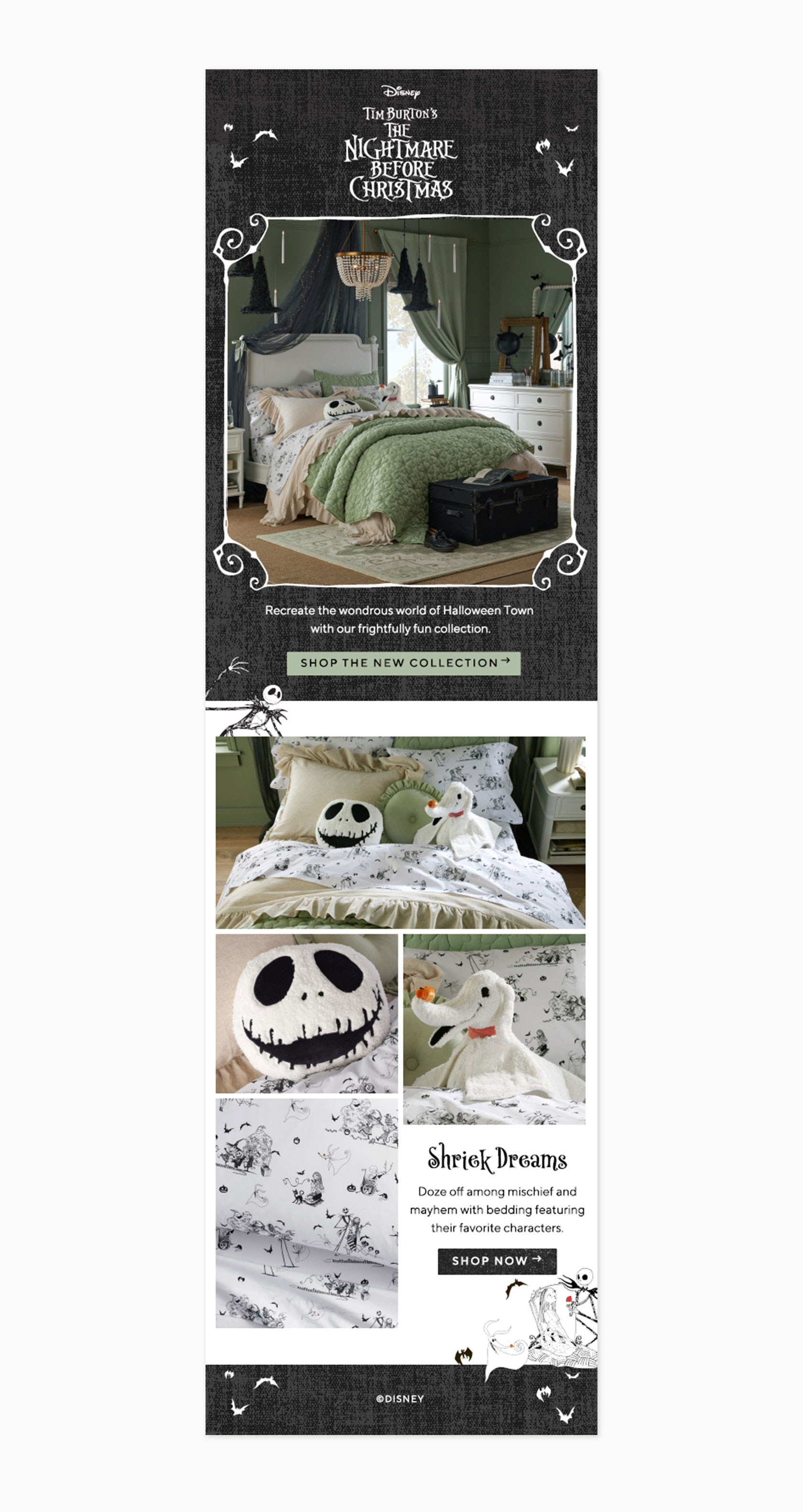This email was designed to feel both stylish and thematic. I used strategic placement of Jack Skellington and other characters to frame the products and lead the reader’s eye down the layout.