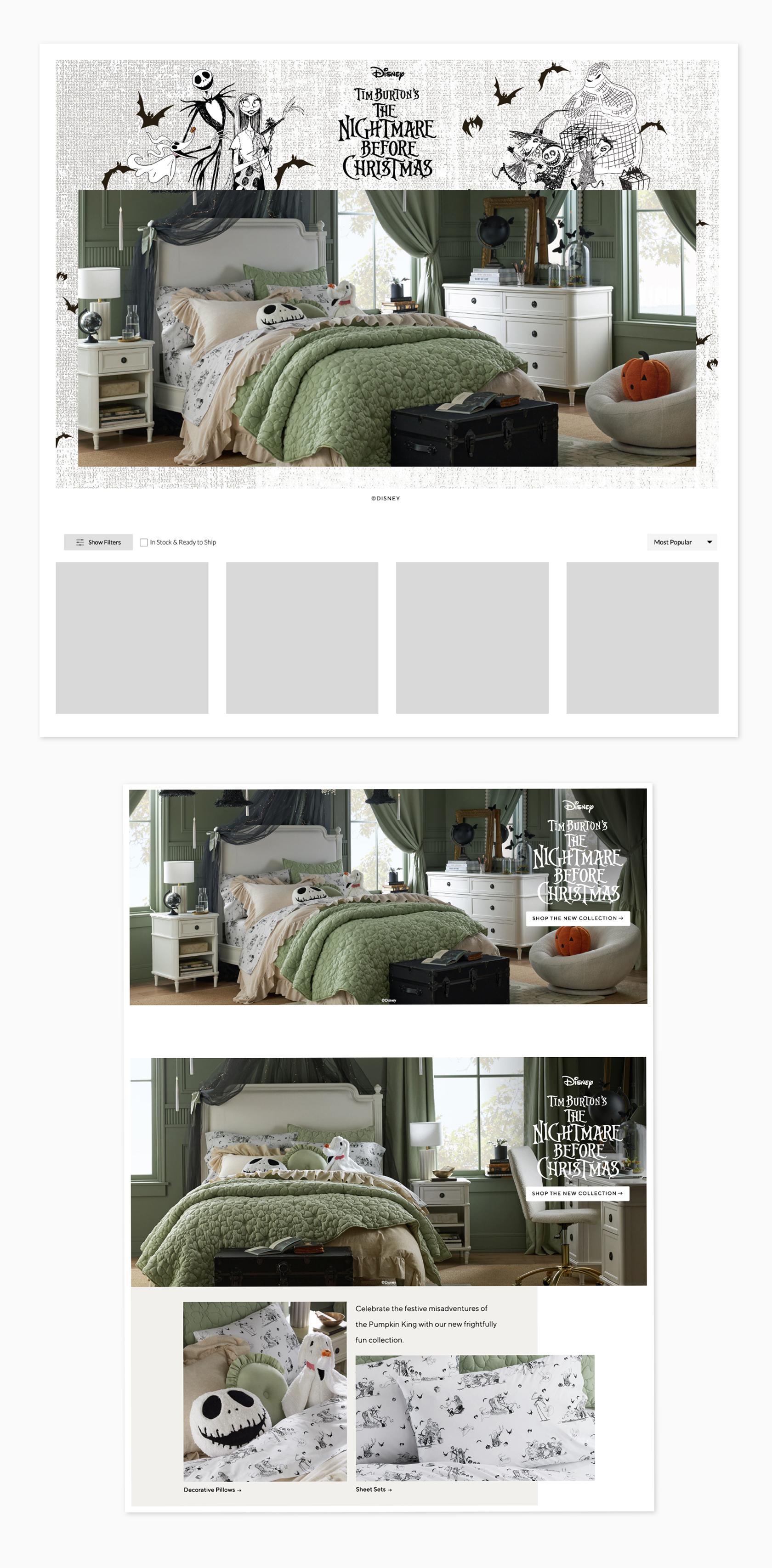 The main goal was to strike a balance, making sure the designs captured the playful, slightly eerie spirit of the film while still feeling elevated. I was mindful about where and how character art appeared, so it supported the product photography instead of overwhelming it. I also pulled from the film’s darker palette to create contrast and mood without making the layout feel too heavy.