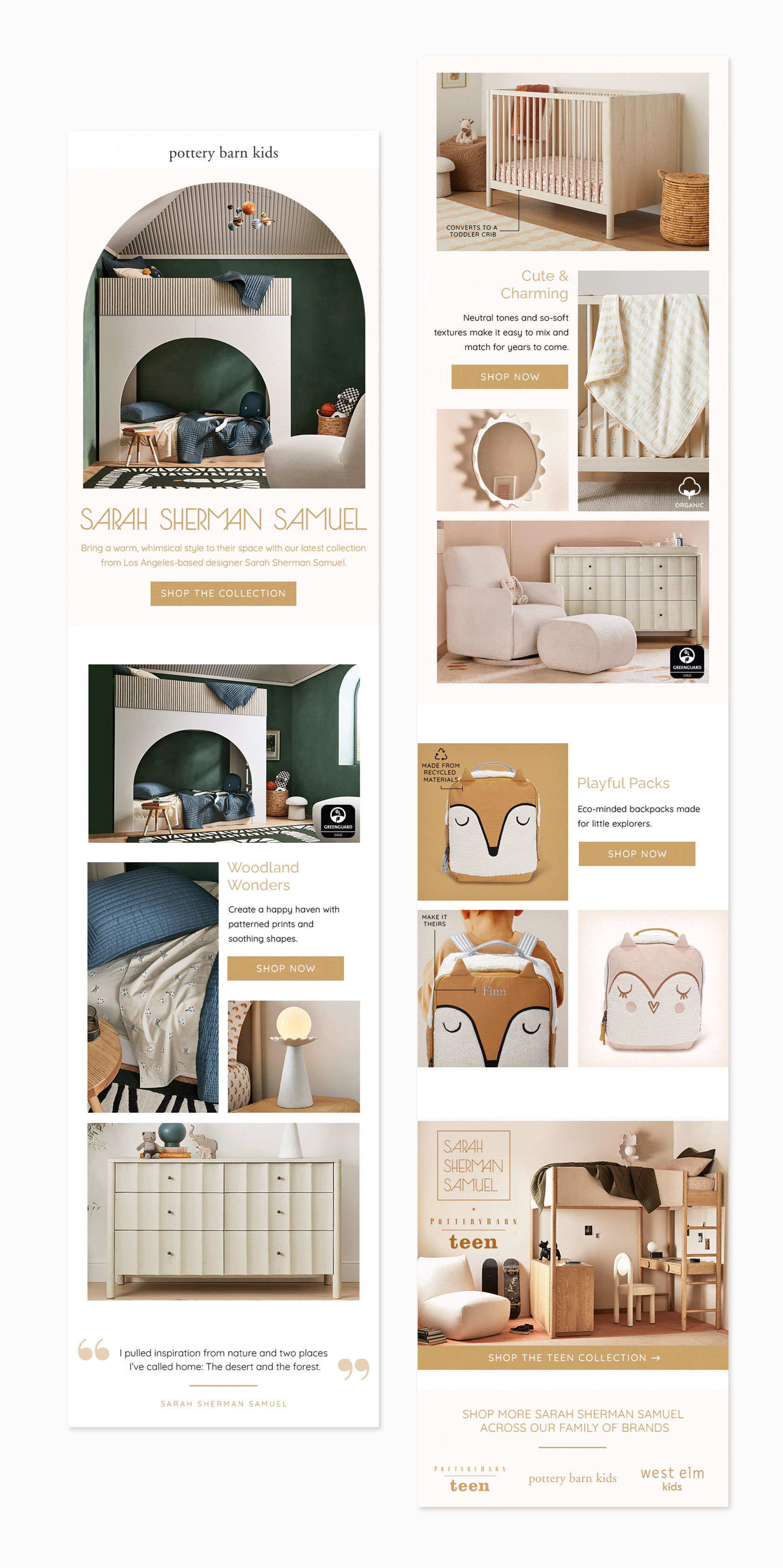 Los Angeles-based interior and product designer Sarah Sherman Samuel partnered with Pottery Barn Kids and West Elm Kids to create a collection of children’s furniture and backpacks. The pieces featured Sarah’s signature contemporary style which consisted of organic shapes, modern lines, and a palette of warm, natural tones.