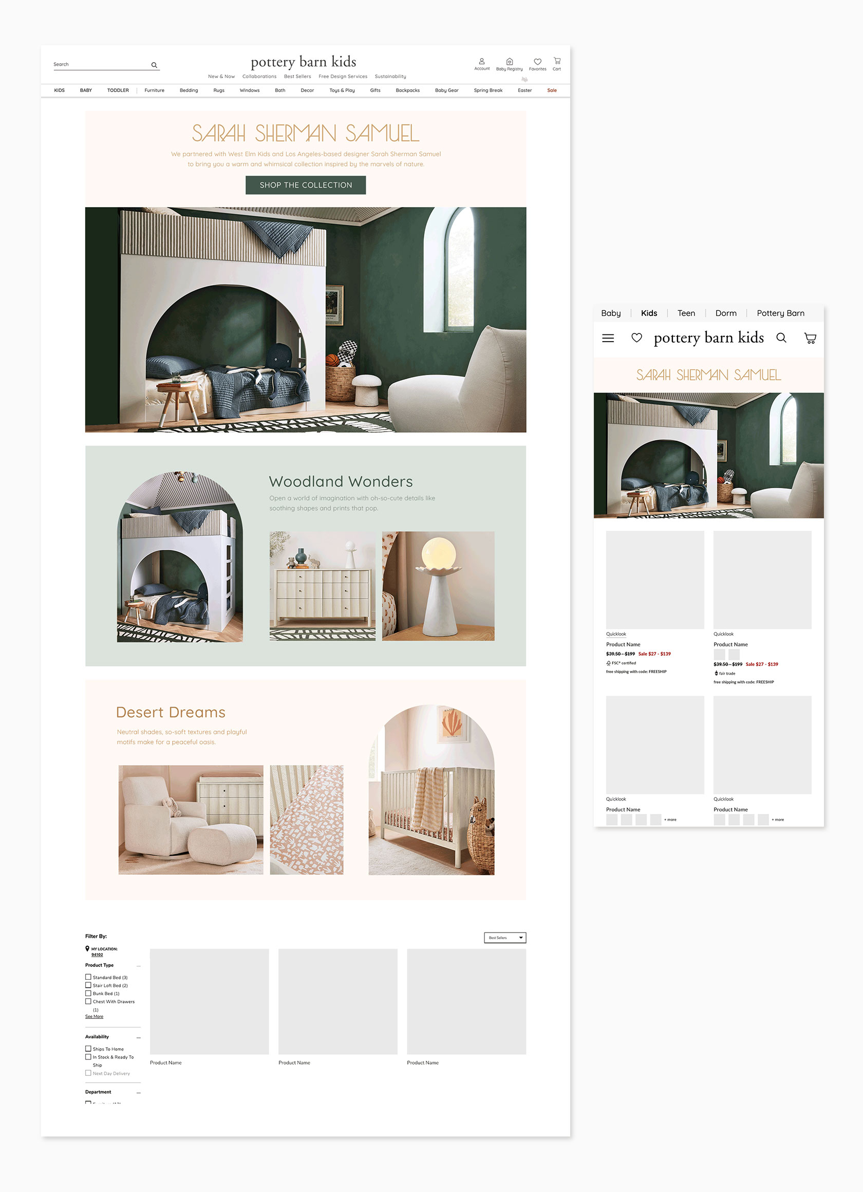 A clean, airy landing page for Pottery Barn Kids showcasing key furniture pieces.